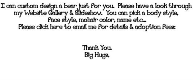 I put my complete heart & soul into each & every one of my bears & I try my hardest to create the bear in the image you desire, but please note that because they are all hand made, it is impossible to make them look "exactly" like the bear you are wanting. They will all have their own unique, individual personalities.
